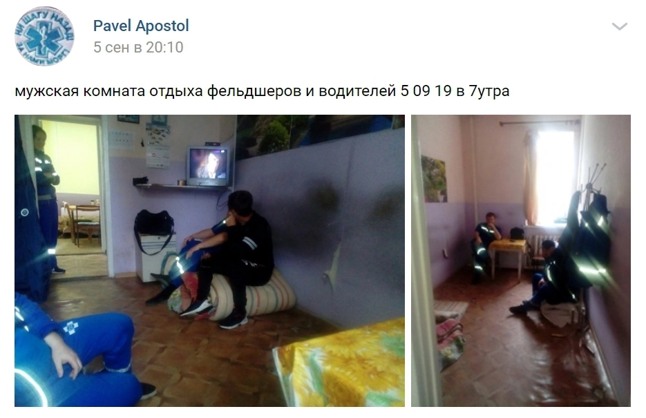 Четвертого сентября медик по имени Павел опубликовал на своей странице «ВКонтакте» фотографии комнат с грязными обоями, где на полу лежат матрасы. На одном из них запечатлен спящий врач. Рядом видны маленький стол и старый стул.