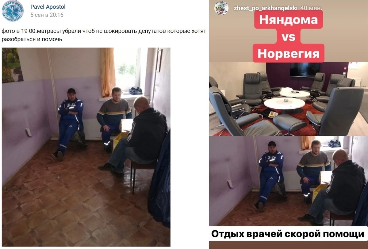 Это реальное фото комнаты отдыха двух бригад ОСМП г. Няндома. Я здесь работаю. Когда мы ждем вызова, то здесь пьем чай, смотрим телевизор. А в каких условиях вы работаете? Кидайте фото, — сказано в посте.