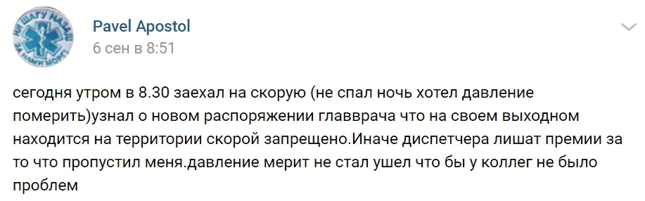 Еще через день Павел сообщил, что главврач распорядился не пускать врачей на территорию отделения скорой помощи, когда у них выходной.