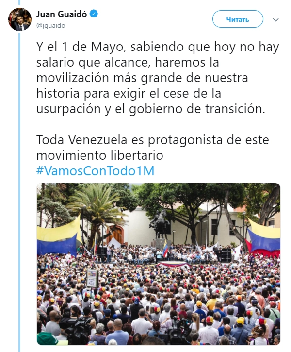 «1 мая мы начнем финальную фазу операции «Свобода», — сообщил Гуайдо в Twitter.