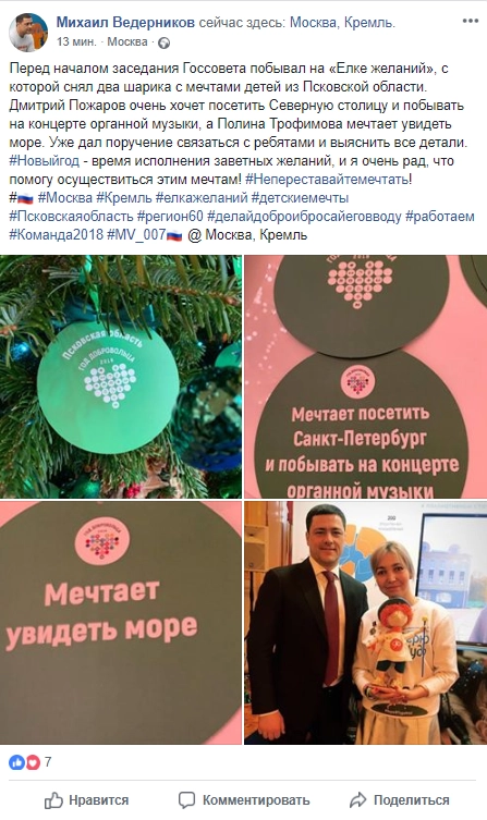 Главы регионов решили последовать примеру президента Владимира Путина и приняли участие в акции, аналогичной проекту «Мечтай со мной». Каждый из губернаторов сорвал с праздничной «Елки желаний» в Кремле по несколько записок с мечтами тяжелобольных детей, чтобы затем исполнить эти желания.