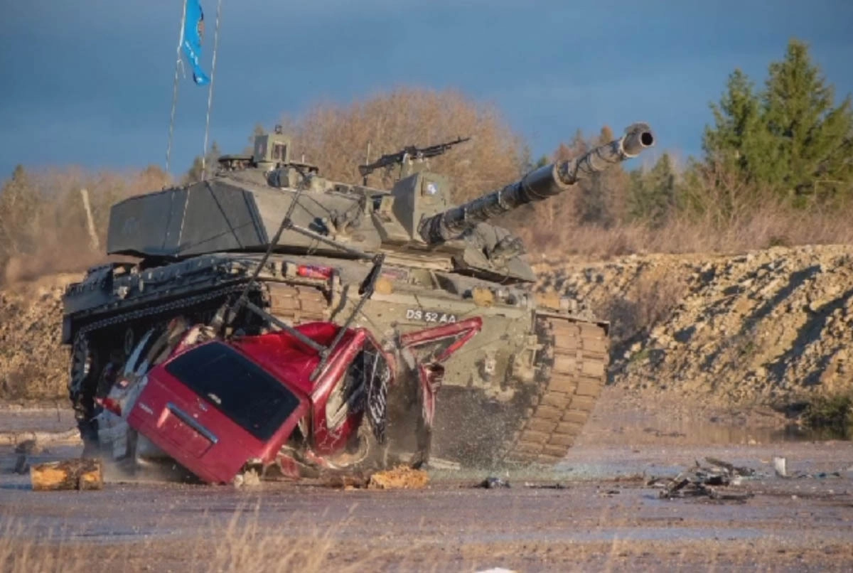 Многотонная бронированная махина наезжает на гражданский автомобиль. Видеозапись того, как гусеницы основного британского танка Challenger 2 давят корпуса машин, опубликовали в Сети.