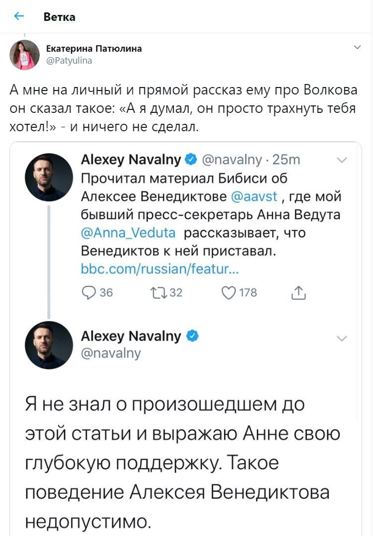 После этого уже самого Алексея Навального обвинили в лицемерии. Бывшая помощница Навального Екатерина Патюлина заявила, что ближайший сотрудник Навального Леонид Волков к ней домогался, она жаловалась, но не добилась никакой реакции. Патюлина также известна как бывшая девушка общественного деятеля, московского муниципального депутата Максима Каца, у которого с Навальным несколько лет назад случился публичный конфликт.