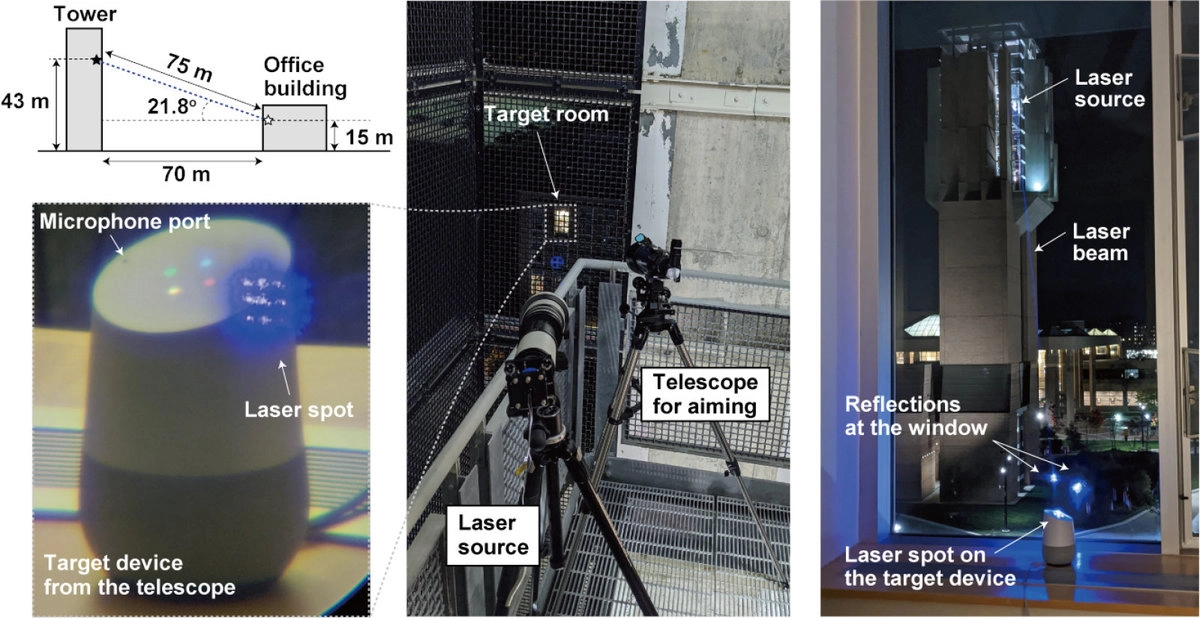Метод взлома работает на дистанции 70—106 метров. Исследователи фокусировали лазер на микрофоне колонки Google Home через окно дома и подавали на нее сигнал, имитирующий голосовую команду «Окей Google, открой дверь гаража». Подключенная к системе умного дома колонка подчинилась.