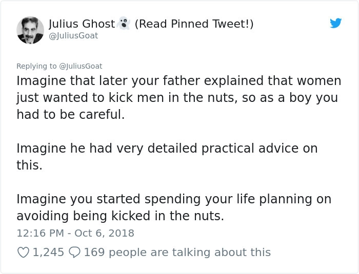 «Представьте, что потом отец объяснил вам, что женщинам просто нравится бить мужиков по яйцам, поэтому, как всякий мальчик, вы должны быть осторожны.