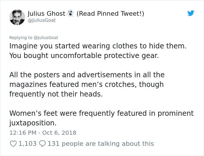 «Представьте, что женщины, в том числе гораздо старше вас — и даже пожилые — постоянно смотрят на ваши яйца. Женщины преследуют вас на улице. Они отпускают комплименты вашим формам. Они говорят, что вы выглядели бы привлекательнее, если бы чуть больше открыли свои яйца».
