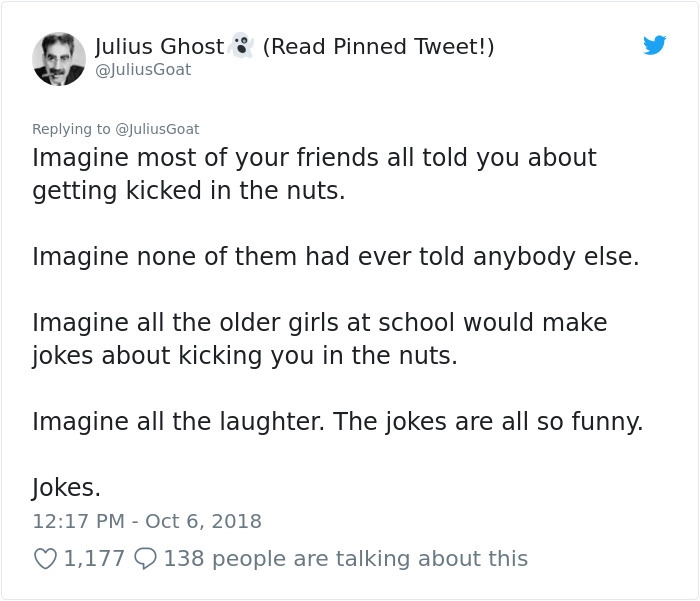 «Представьте, что большинство друзей рассказывают вам, что их тоже били по яйцам.