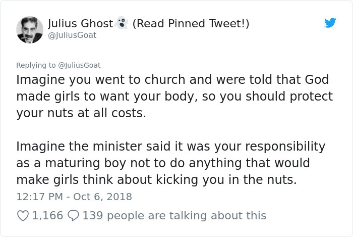 Представьте, что священник говорит вам, что ваша обязанность как взрослеющего мальчика — не вести себя так, чтобы девочкам захотелось ударить вас по яйцам».