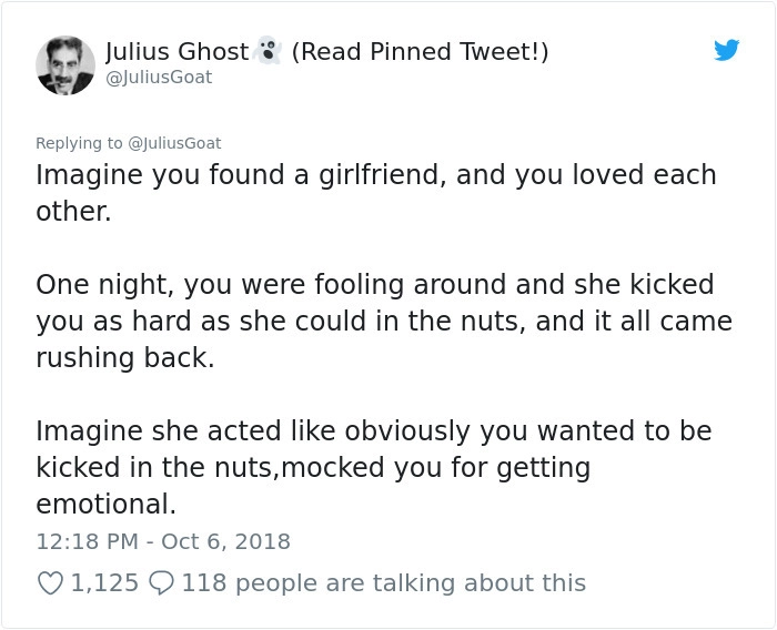 «Привет, мужики! Представьте себе, что однажды вам дали по яйцам — со всей силы, намеренно.