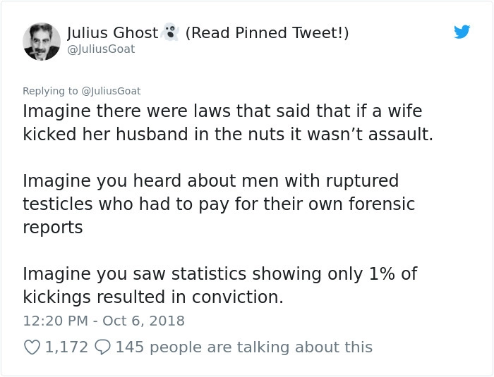 «Представьте, что вы заявили об этом в полицию, а в ответ вас спросили, что на вас было надето, когда она дала вам по яйцам. Может быть, вы выпивали? А чем вы занимались до того? Может, разделись? Ещё и целовались?