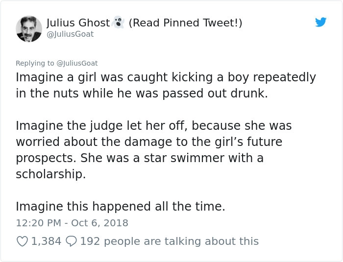 «Представьте, что девочка попалась бы на том, что многократно била мальчика по яйцам, когда он был в пьяном беспамятстве.