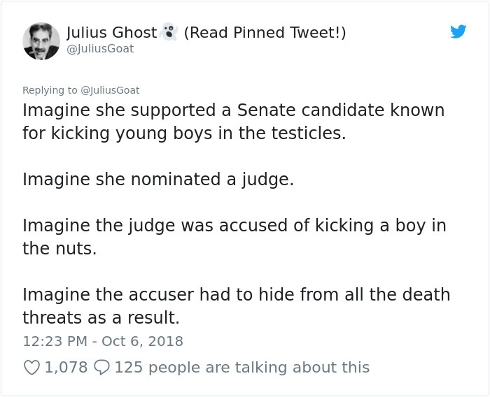 «Представьте, что она поддерживает кандидатку в Сенат, которая прославилась тем, что бьёт юных мальчиков по яйцам.