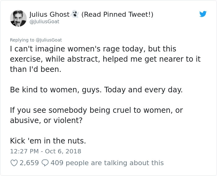 На написание скандального треда в Twitter автора сподвигло назначение судьи Бретта Кавано, который ранее обвинялся в сексуальном насилии, в Верховный суд США. Скандальное назначение вызвало волну протеста по всему миру. Поэтому Моксон, известный в Сети под ником JuliusGoat, решил описать женский опыт сексуального насилия так, чтобы это было понятно мужчинам, и придумал для этого идеальную аналогию.