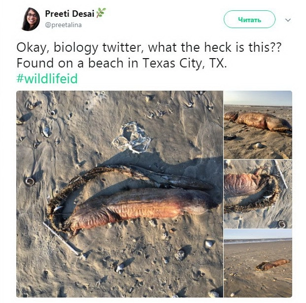 Жительница Техаса по имени Прити Десаи обнаружила на местном пляже мертвое зубастое существо, вероятно, выброшенное на берег после урагана «Харви». Шестого сентября она опубликовала фотографии морского гада в Twitter и попросила помощи в его определении.