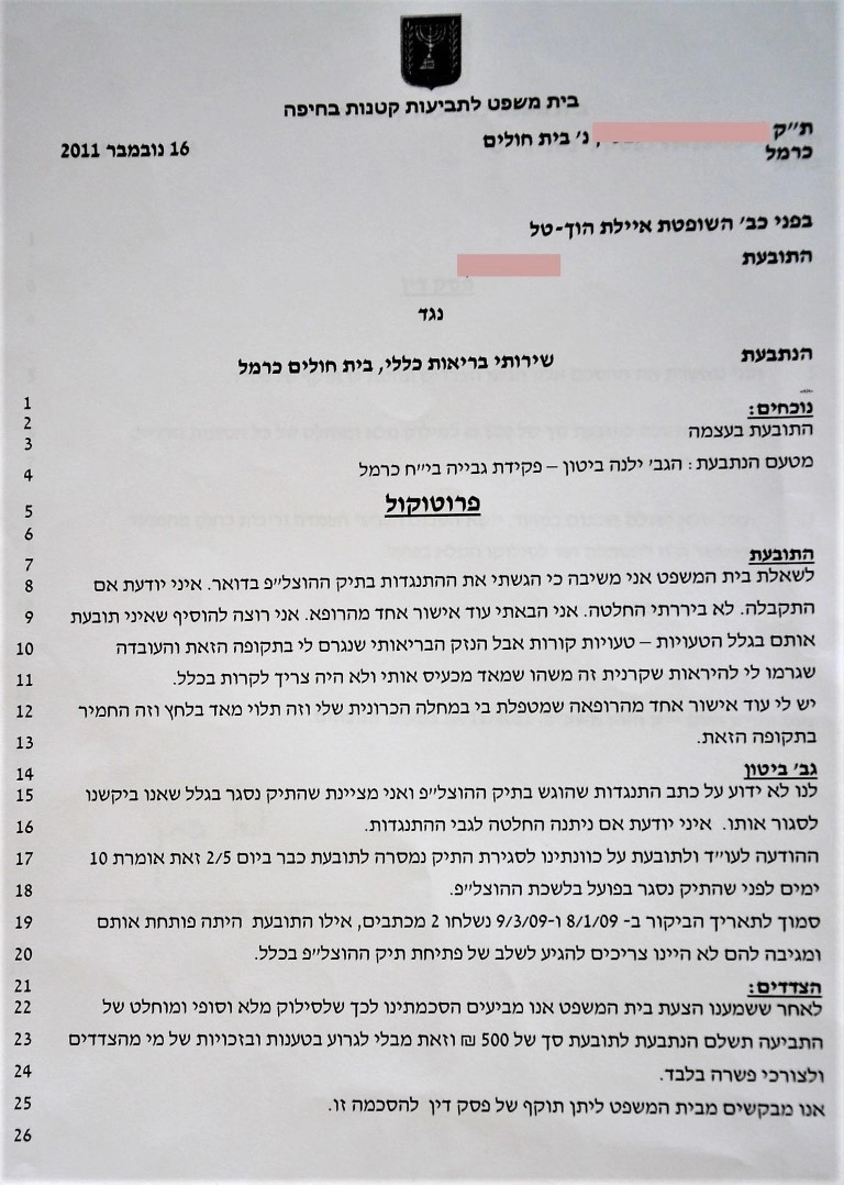 Но меня там не было и истцы согласились на мировую, на которой больница согласилась им выплатить символические 500 шекелей ($150) за моральный вред. Судья заверил соглашение.
