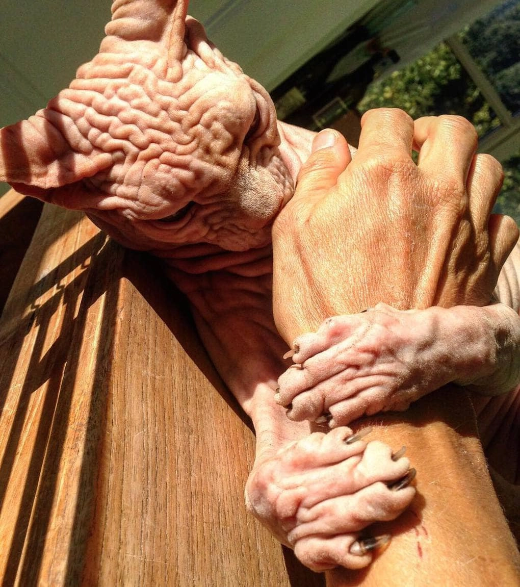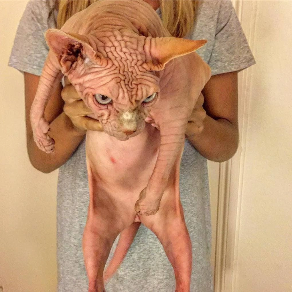 Знакомьтесь, это Джордан — канадский сфинкс, обладающий весьма морщинистым телом и суровой мордочкой