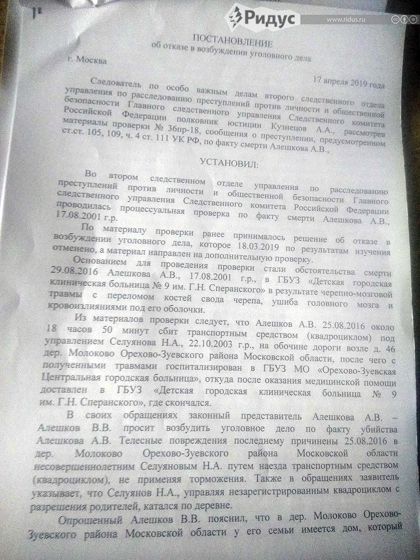 Три года назад в последние дни летних каникул в деревне Молоково в Орехово-Зуевском районе Московской области 15-летний Саша Алешков вместе со своим другом гулял на обочине дороги. В этот момент сосед по даче, 12-летний Никита Селуянов, катался по деревне на квадроцикле. Заметив своих сверстников, он сместился на обочину и наехал на Сашу, который шел спиной к лихачу.