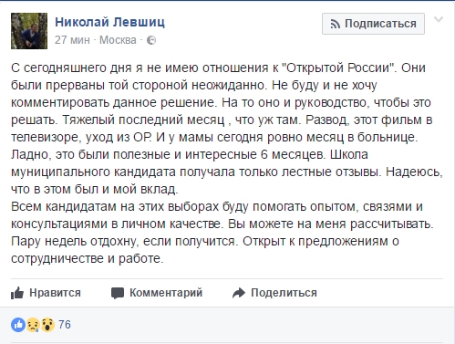 Руководитель образовательного центра «Открытые выборы» (организация, подконтрольная движению Ходорковского «Открытая Россия». — Прим. «Ридус») Николай Левшиц лишился поста. По данным источника «Ридуса», знакомого с ситуацией, Левшиц был уволен по личному распоряжению основного спонсора центра, экс-главы ЮКОСа Михаила Ходорковского.