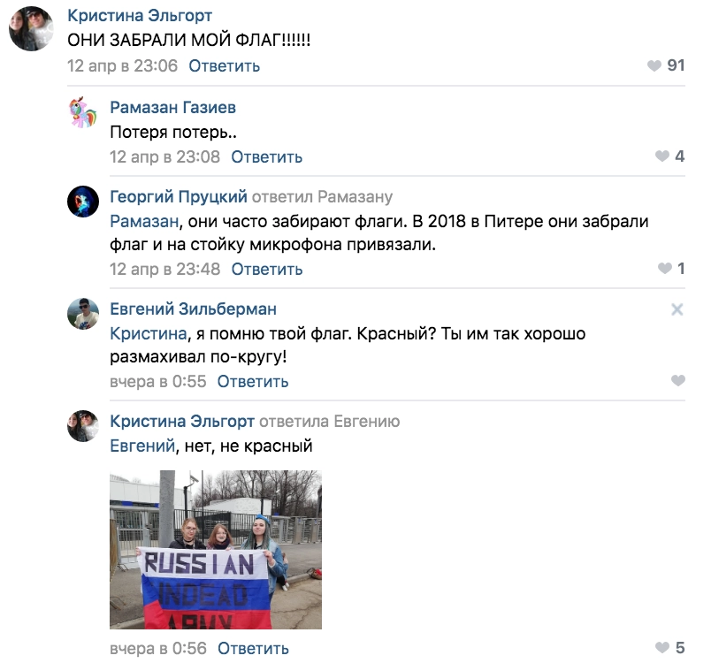 Владельцы флага с надписью «Russian Undead Army» быстро объявились в официальном сообществе группы «ВКонтакте» — где с нескрываемой гордостью сообщили о своем вкладе в шоу калифорнийцев.
