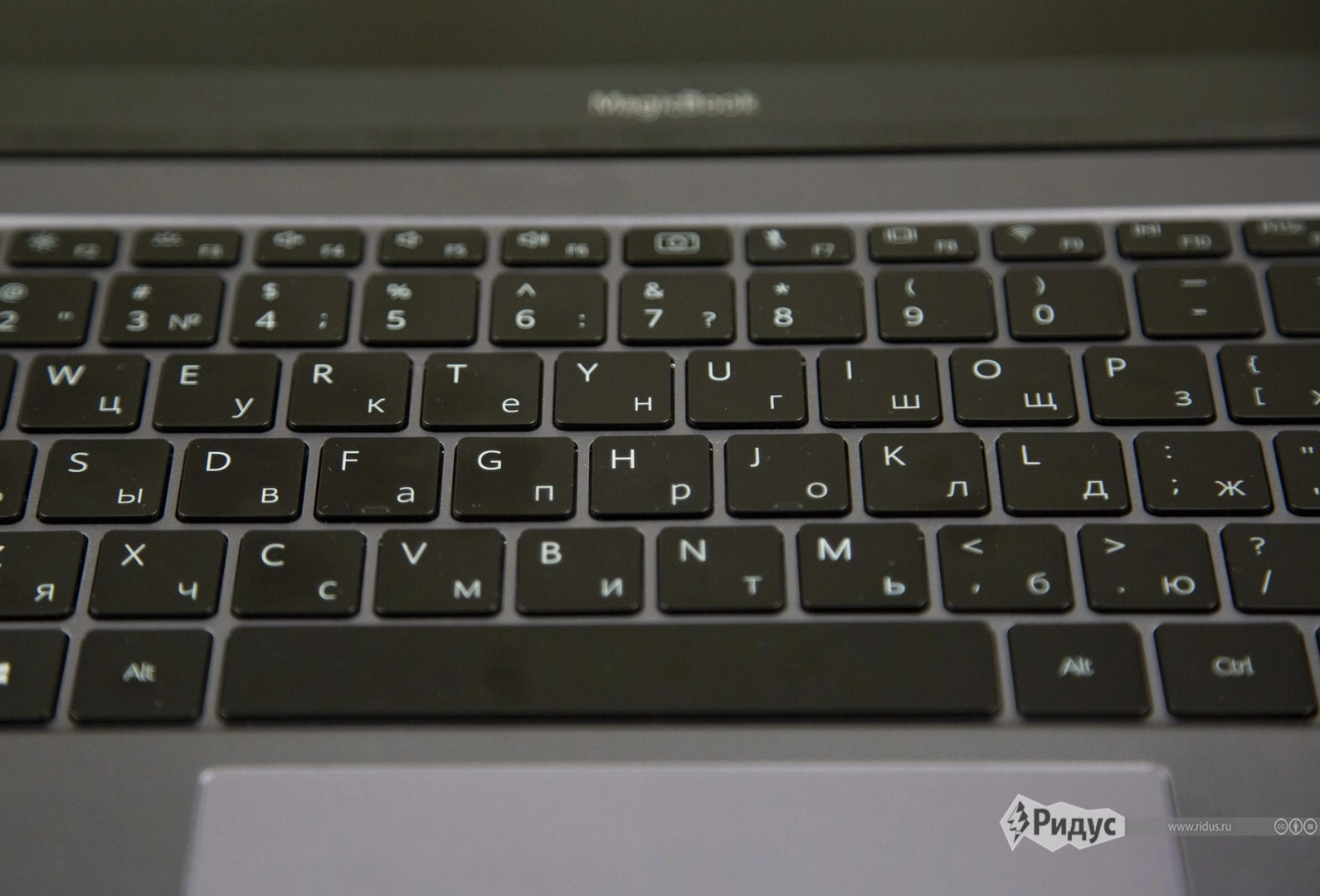 При раскрытии ноутбука уже становятся заметны сходства с MacBook. В частности клавиатура девайса очень похожа на таковую у конкурента из Купертино, а логотип MagicBook своим расположением и шрифтом напоминает MacBook.