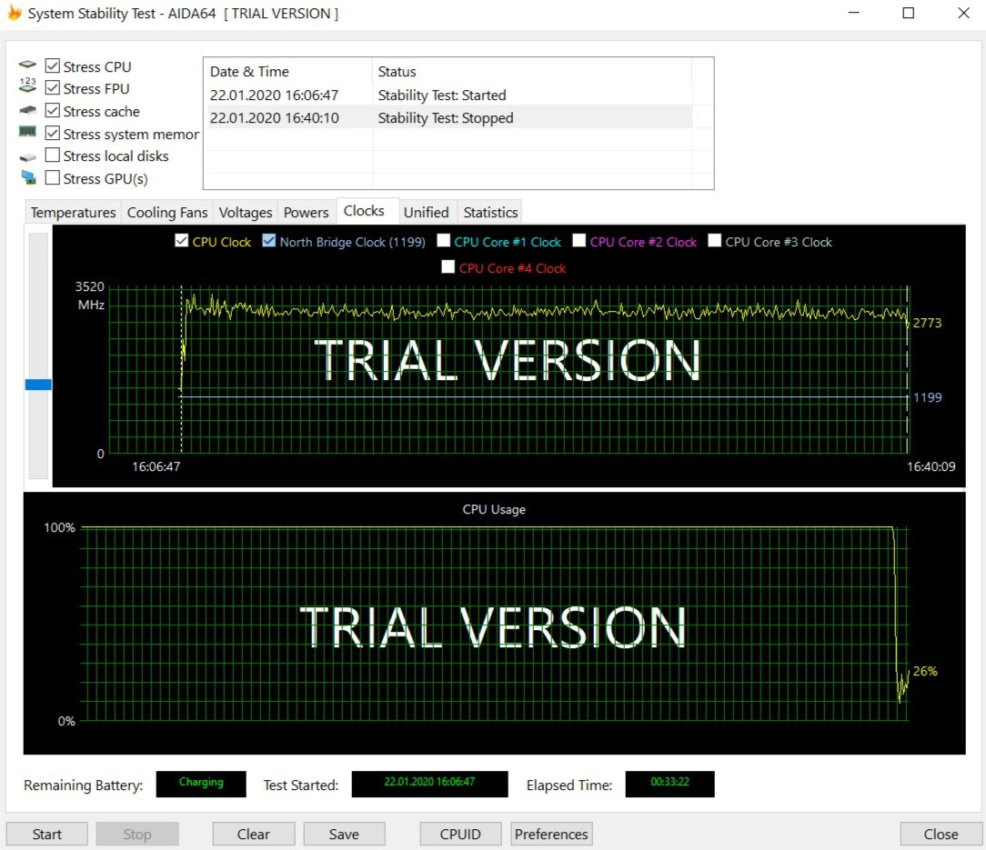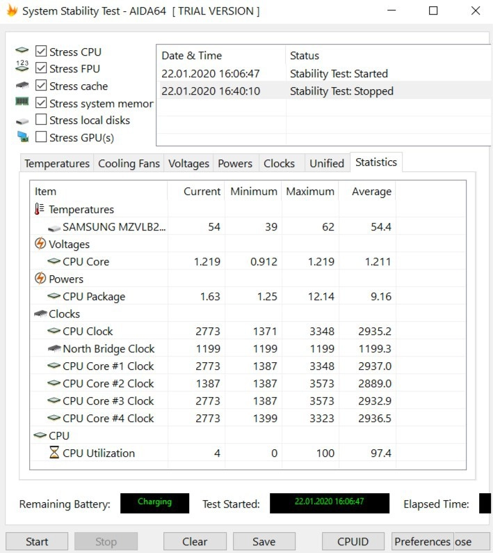 Процессор действительно крутой, он очень хорошо показывает себя не только в работе с повседневными задачами, но и в стресс-тесте. За полчаса прогона стресс-теста AIDA64 процессор не сбрасывал частоты, а его температура не поднималась выше 62 градусов. Это очень хороший результат. При прогоне в стресс-тесте активно работала система охлаждения, чтобы охладить процессор, поэтому шум кулера был слышен. При работе с повседневными задачами температура процессора не поднимается выше комфортных значений, поэтому ноутбук почти всегда холодный.