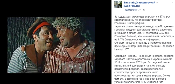 Премьер-министр Украины Владимир Гройсман решил порадовать украинцев хорошими новостями о зарплате. Он привел данные Госстата, согласно которым в марте 2017 года средняя зарплата в стране составила 6752 гривны (около 14494 рублей).