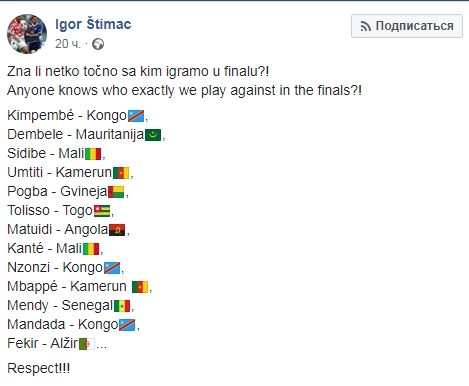 В Twitter он опубликовал список из 13 игроков, которые являются выходцами из стран Африки. В их числе оказались камерунцы Мбаппе и Умтити, малийцы Сидибе и Канте, конголезцы Кимпембе, Нзонзи и Манданда, а также мавританец Дембеле, гвинеец Погба, анголец Матюиди, сенегалец Менди, алжирец Фекир и Толиссо из Того.