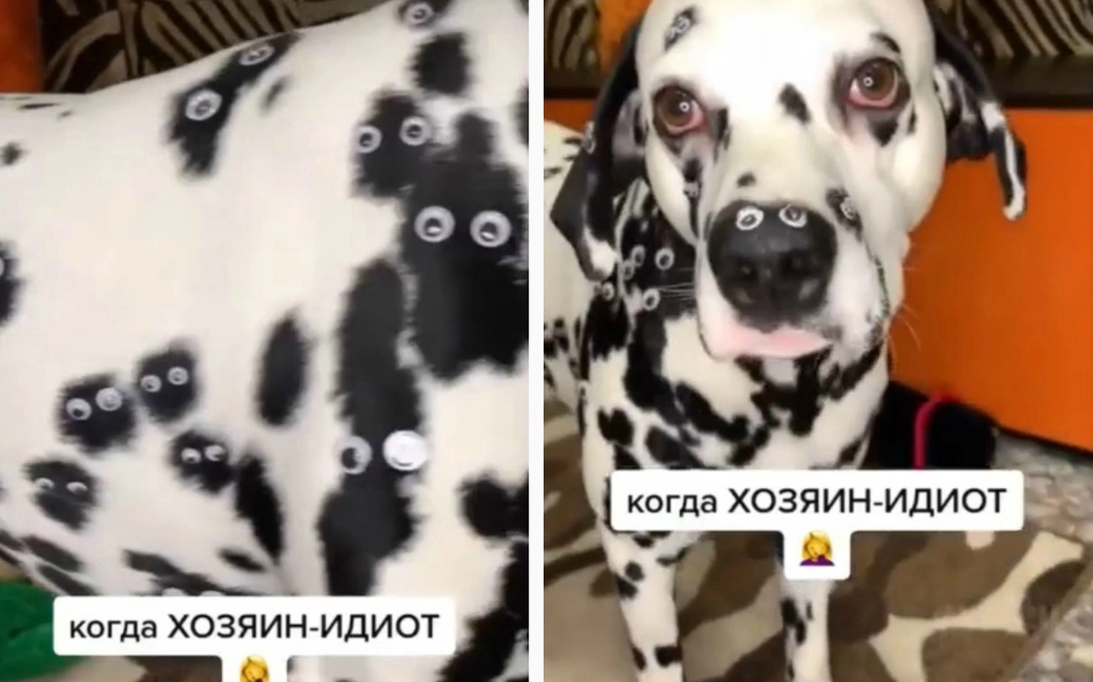 В Instgaram стало популярным видео с псом, которого хозяин превратил в настоящий кошмар трипофоба (трипофобия — боязнь кластерных отверстий). Мужчина всего лишь приклеил маленькие пластмассовые глаза к пятнышкам своего далматина, из-за чего тот стал похож на жуткое и странное существо с отверстиями по всему телу. Жена хозяина собаки шутку над пёселем явно не оценила, о чем она громко заявляет в самом начале ролика.