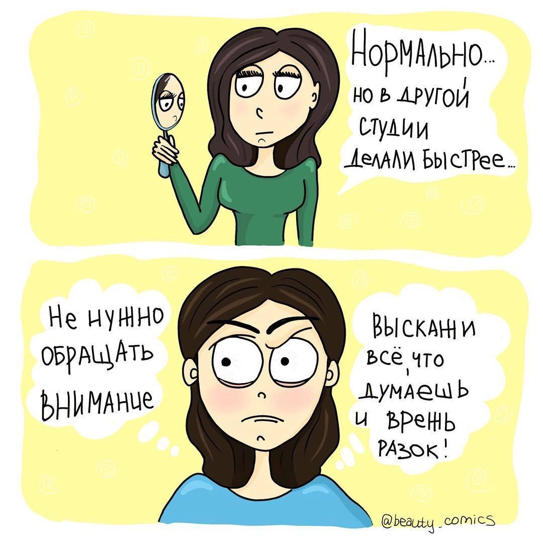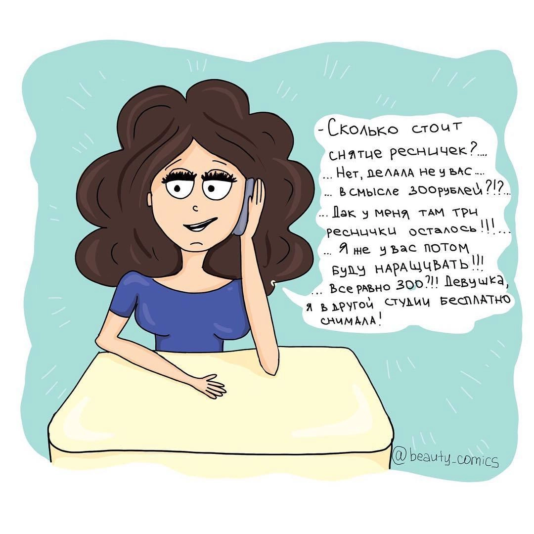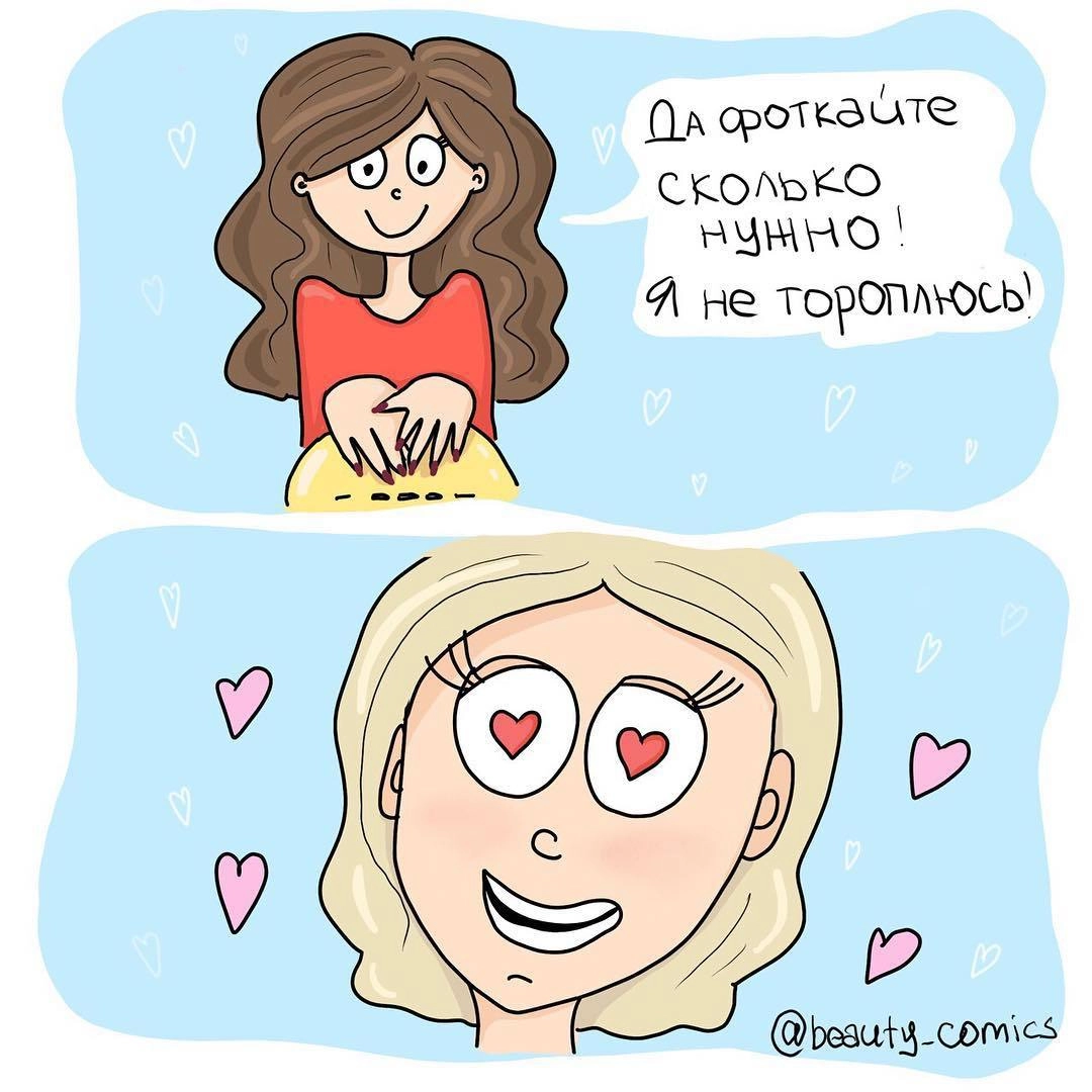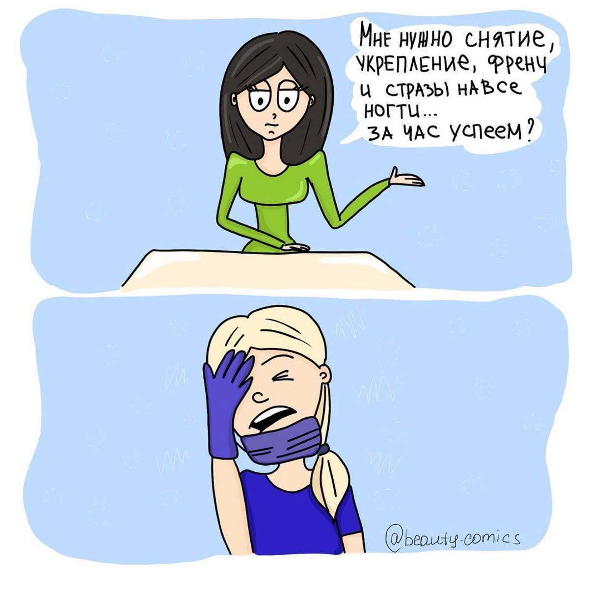 28-летняя Мария Зык живёт в Екатеринбурге и руководит своей небольшой студией красоты. А в свободное от ноготочков и ресничек время рисует забавные бьюти-комиксы о буднях мастеров и непростых клиентах. На своей страничке в Instagram Мария рассказывает, что по образованию она журналист, но работать по специальности не захотела и решила открыть собственный бизнес. А рисовать любит с детства и даже училась в художественной школе.