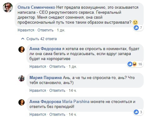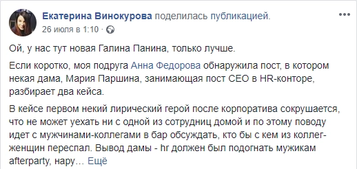 Позже Паршина написала большой пост, где объяснила, что не является эйчаром и поэтому не обязана следовать корпоративной этике.