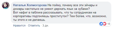 «Смотри, ань. Поведение профессионального hr в твоём случае выглядит так: мы с юристом разобрали твой пост и комментарии, сделали скриншоты каждого комментария! завтра мы их нотариально заверим, далее мы готовим 2 дела, 1) ущерб репутации бренда компании… 2) об оскорблении чести и достоинства лично меня, мне ты тоже прикрутила какие-то непотребные вещи, которыми я не никогда занималась и не планирую. Я жена и мама, у меня есть ребёнок, который живет в социуме, есть муж, который работает на очень серьезном уровне, а ты решила что тебе скучно, и ты можешь таким образом повеселиться, бросить тень на достойную семью. Ты повеселилась, ань. А теперь ты за это ответишь в правовом поле», — написала представитель Grintern (орфография и пунктуация автора сохранены).