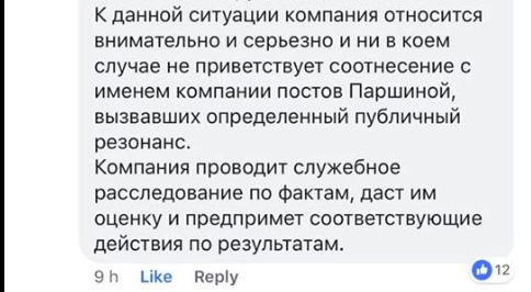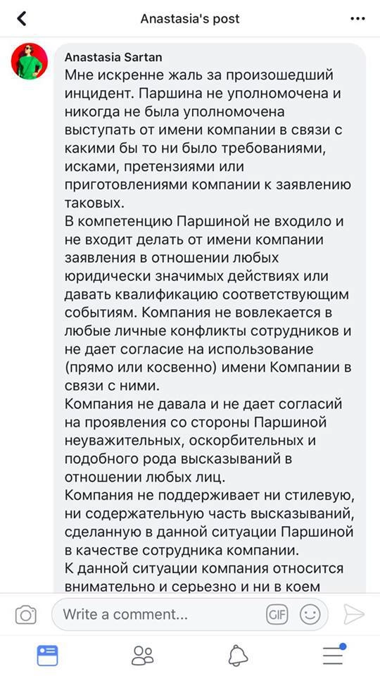 «В компетенцию Паршиной не входило и не входит делать от имени компании заявления [по поводу] любых юридически значимых действий… Компания не давала и не дает согласия на проявления со стороны Паршиной неуважительных, оскорбительных и подобного рода высказываний в отношении любых лиц… Компания проводит служебное расследование по фактам, даст им оценку и предпримет соответствующие действия по результатам», — отметила Сартан.