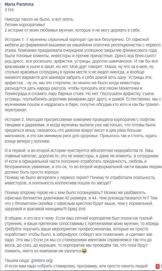HR-компания Grintern опубликовала официальный комментарий по поводу высказываний главного исполнительного директора Марии Паршиной. Несколько дней назад она рассказала в Facebook о жалобах знакомых мужчин на скучные корпоративы и посоветовала кадровикам «разбавлять офисных бегемотих девочками размера 42—44».