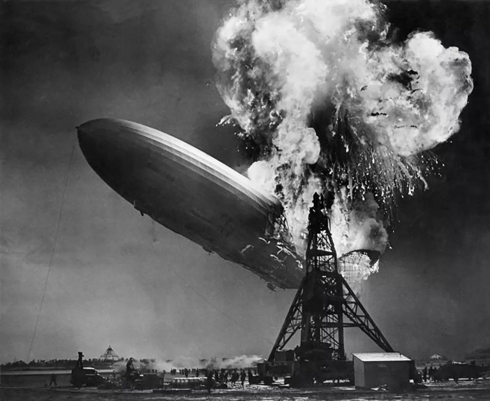 Официально считается, что пожар на нем вызвало падение одной из опор. Но еще в довоенное время обсуждалась вероятность диверсии. Якобы один из членов экипажа, антифашистски настроенный, пронес бомбу с часовым механизмом, которая взорвалась раньше намеченного времени из-за задержки посадки «Гинденбурга» ввиду плохих метеоусловий.