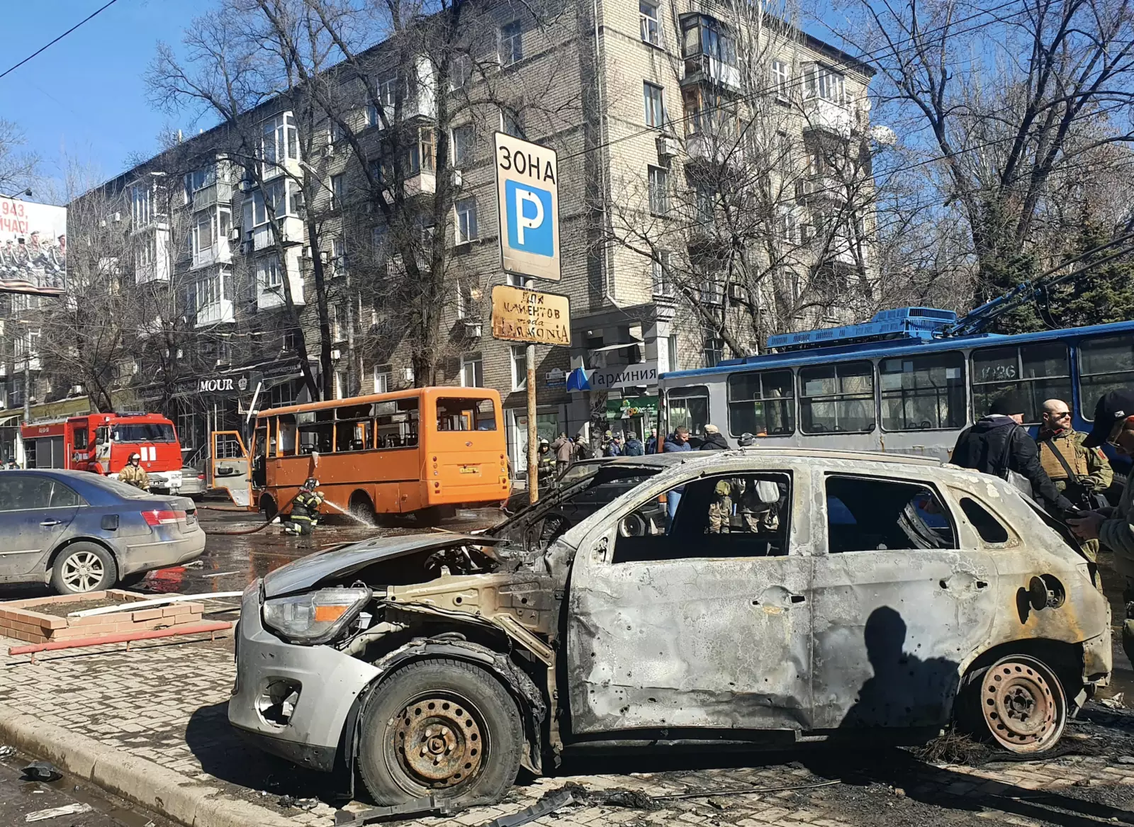 Понедельник 14 марта выдался теплый, солнечный и безветренный день, поэтому на улицах было много людей не только спешащих по делам, но и просто наслаждающихся редкими в эти дни тишиной и солнцем. Разрыв около 12 часов дня слышал весь город, люди были напуганы, некоторые спустились в укрытия. Вскоре со стороны административного центра повалил столб дыма, а Донецк наполнился звуками сирен скорых и пожарных бригад.