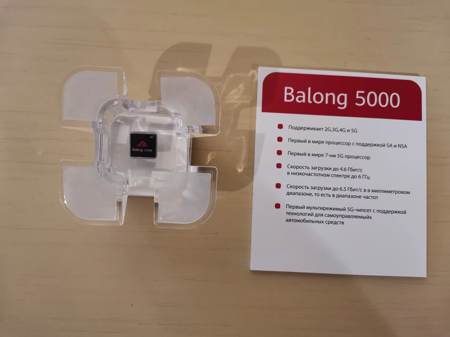 Huawei разработала 5G-чип Balong 5000 для смартфонов и беспроводных роутеров. Он поддерживает одновременную работу в сетях 2G, 3G, 4G и 5G и выполнен по технологическому процессу 7 нм. Как утверждает технический директор Эван Луо, ближайший конкурент на рынке 5G-модемов, компания Qualcomm, отстает от Huawei на полгода.