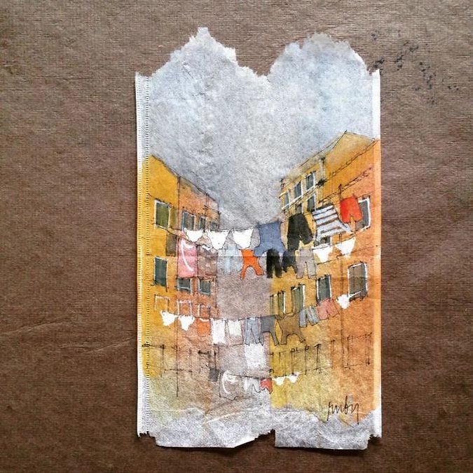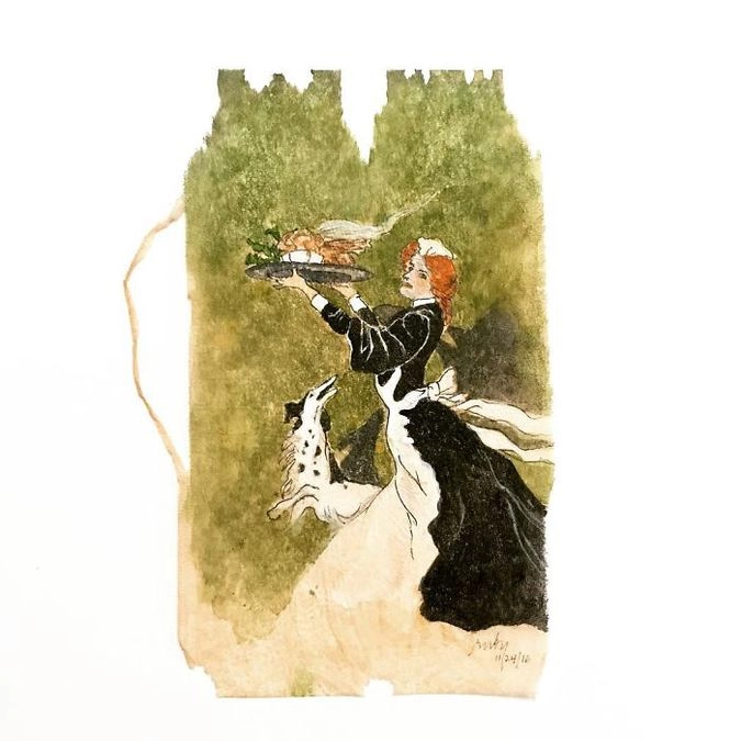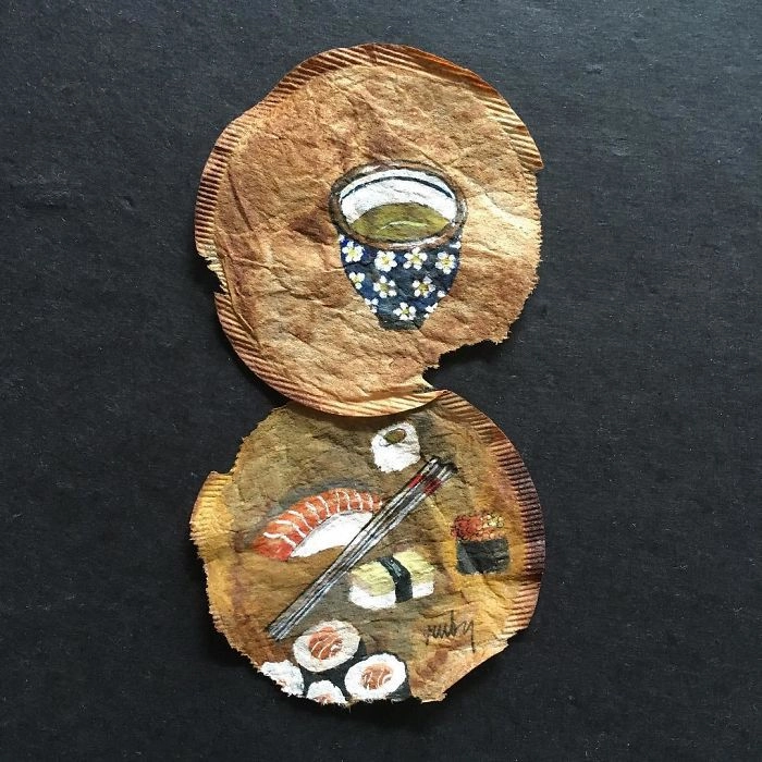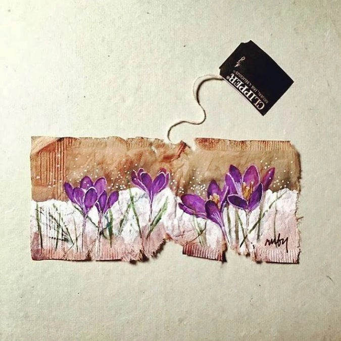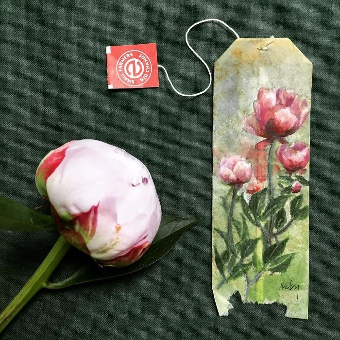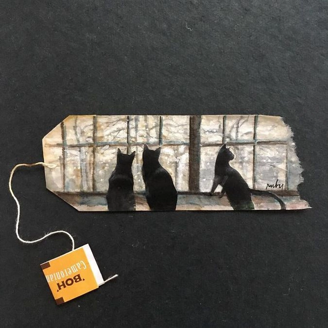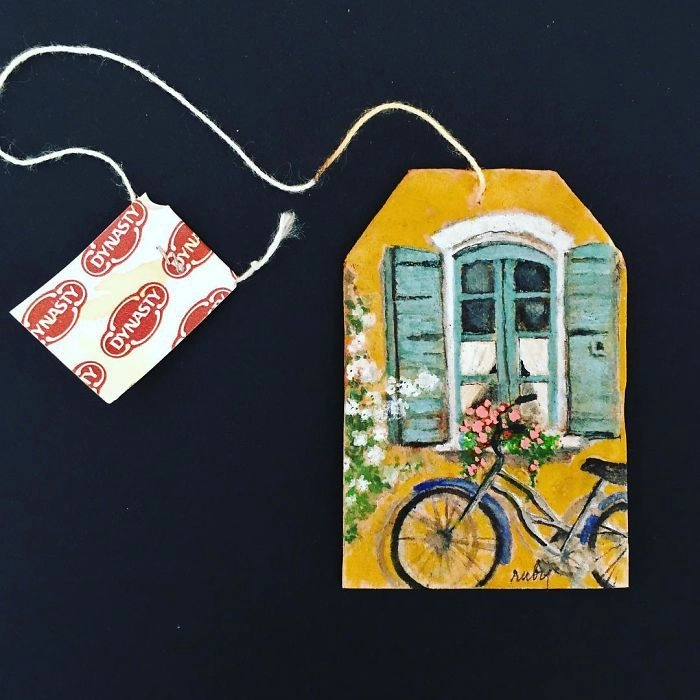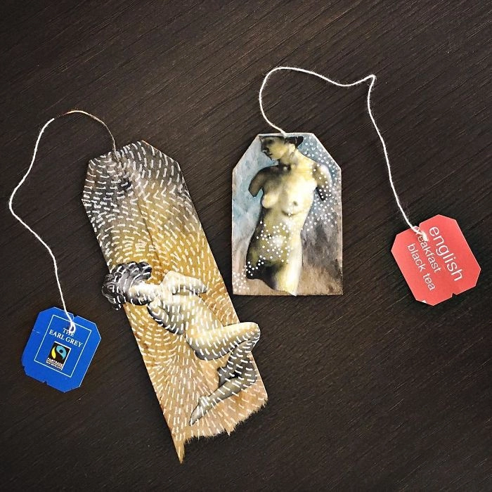 «Пакетик чая после того, как его выпили, выглядит не особо привлекательно. И тогда как большинство людей их выкидывают, я в каждом из них вижу пустой холст для своего творчества. Я люблю рисовать свои воспоминания и причудливые картины, которые подсказывает мне моя фантазия. Иногда, чтобы найти вдохновение, надо выйти за рамки традиционного творчества. Даже использованные чайные пакетики могут стать новой уникальной формой искусства», — говорит художница и уже третий год выкладывает на свою в страничку в Instagram всё новые шедевры.