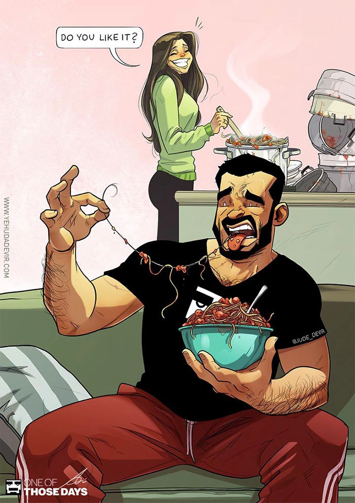 Вам наверняка уже известно имя израильского художника Иегуды Ади Девира (Yehuda Devir). Он рисует те самые яркие, честные и смешные иллюстрации о жизни с любимой женой Майей, благодаря которым он прославился на весь мир и снискал любовь миллионов интернет-пользователей. «Ридус» уже публиковал его талантливые работы, а теперь художник порадовал поклонников новой серией своих восхитительных комиксов.