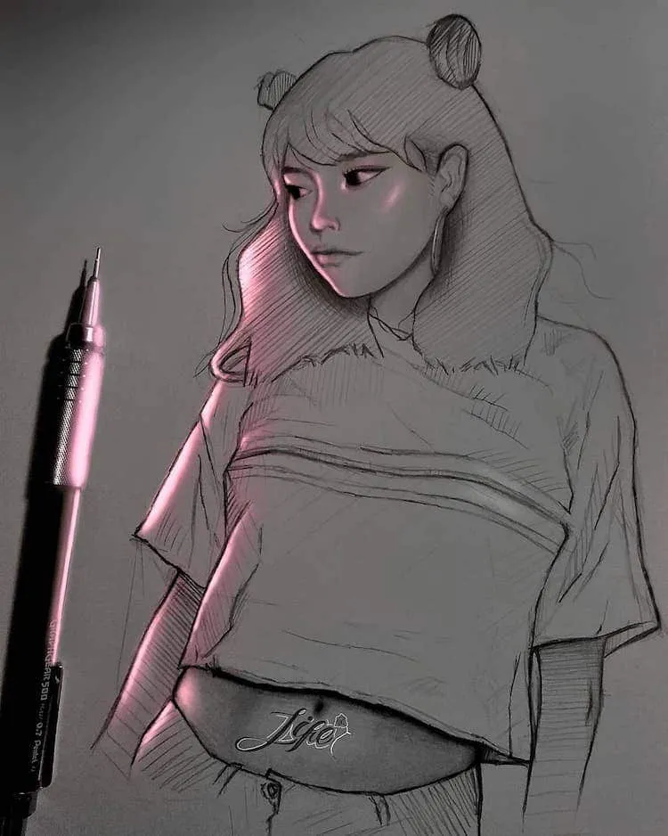 Чаще всего художник добавляет блики таким образом, чтобы казалось, что девушки согреты каким-то таинственным светом. Он также помещает на свои портреты маленькие светящиеся татуировки или бабочек.