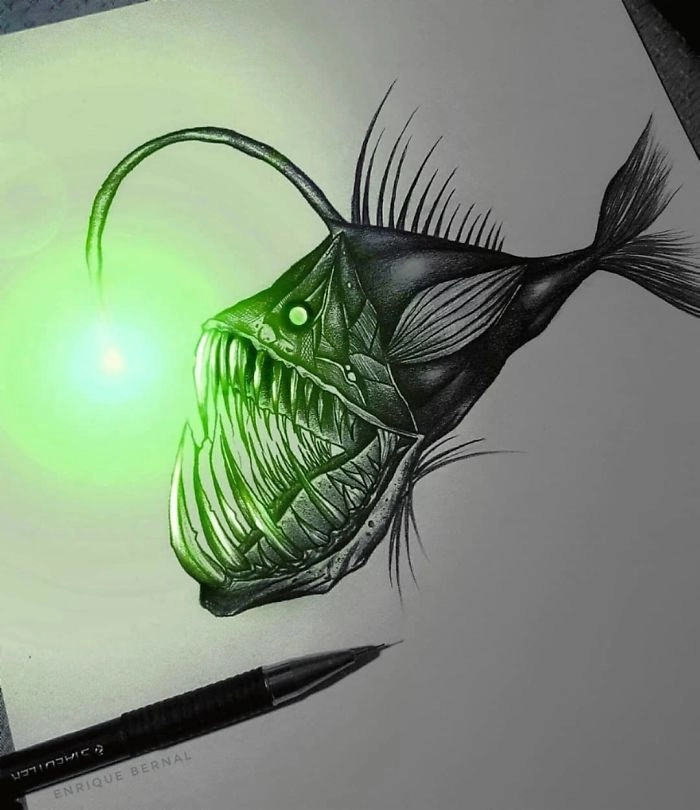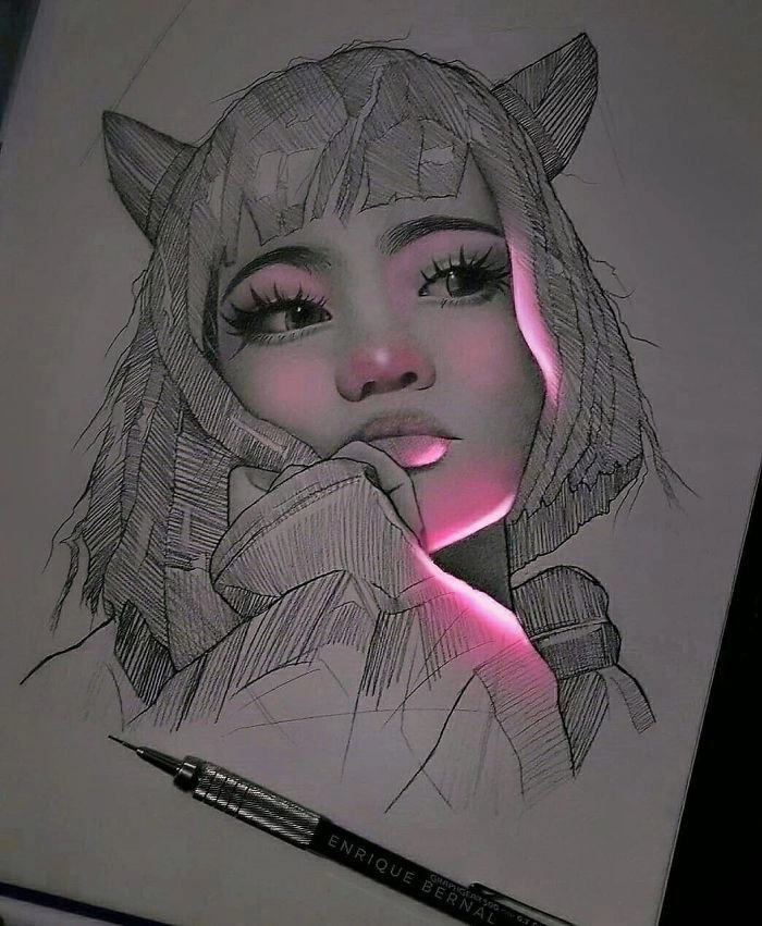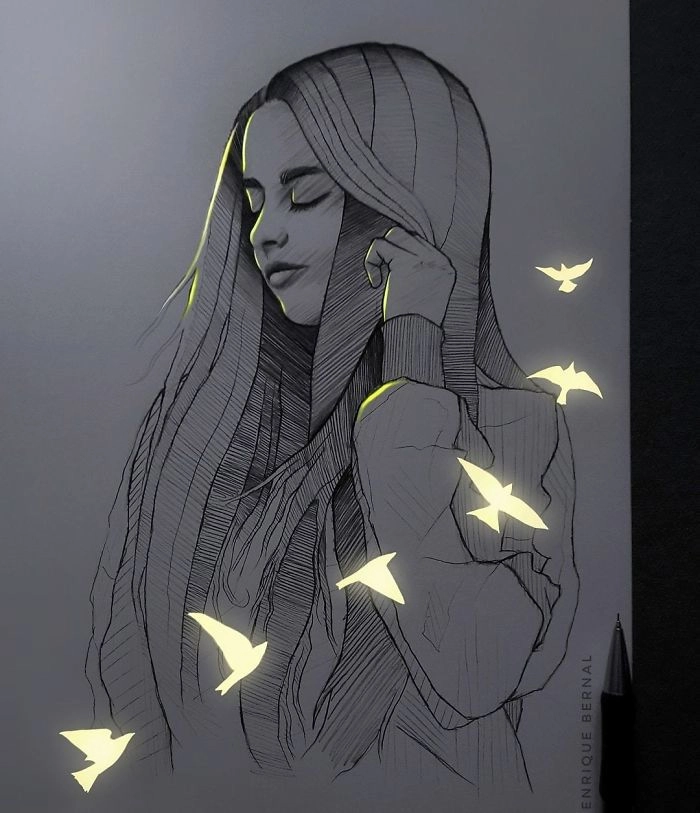 Мексиканский художник Энрике Бернтал нашел простой, но невероятно крутой способ сделать свои рисунки уникальными и выделить их из множества творений в соцсетях. После того как парень заканчивает обычные черно-белые наброски на бумаге, он добавляет к ним парочку световых эффектов, которые полностью преображают их.