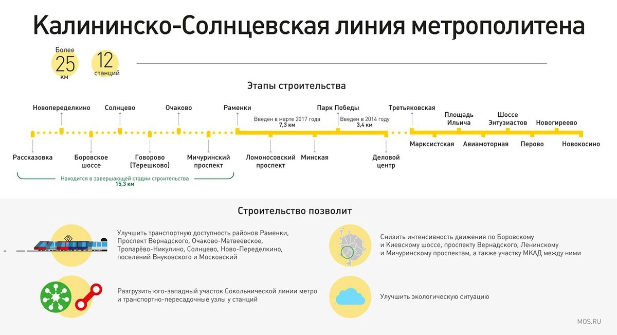 Новый участок Калининско-Солнцевской ветки протяженностью около 14 км включает в себя станции «Мичуринский проспект», «Озерная», «Говорово», «Солнцево», «Боровскоешоссе», «Новопеределкино» и «Рассказовка».