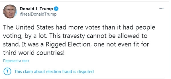 «В Соединенных Штатах оказалось больше голосов, чем избирателей, причем намного. Нельзя позволить этой пародии продолжаться. Это были сфальсифицированные выборы, не соответствующие даже уровню стран третьего мира», — написал Трамп в Twitter.