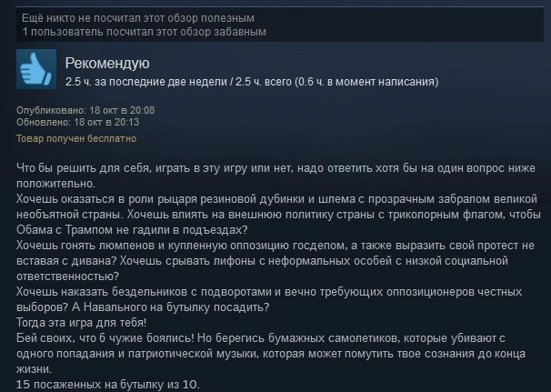 Игра вышла после московских протестов 2019 года и сразу привлекла к себе внимание. Главным противником в игре является оппозиционер Карнавальный (уже переименованный в Невского) и его компания. Также в симуляторе присутствуют главы России и США, а еще можно устраивать гонки на автозаках и раздевать «революционерок».