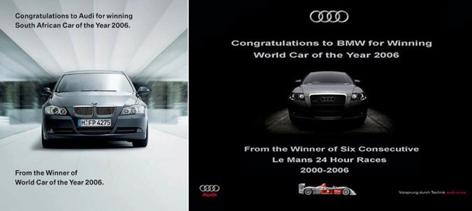 Известно противостояние BMW и Audi. В 2006 году баварский автопроизводитель опубликовал рекламу с текстом: «Поздравляем Audi, ставшую лучшей машиной 2006 года в ЮАР. От обладателя статуса „Лучшая машина в мире“ 2006 года». Audi ответили подколом: «Поздравляем BMW, ставшую лучшей машиной 2006 года. От шестикратного подряд победителя круглосуточных гонок Le Mans 2000−2006 годов».
