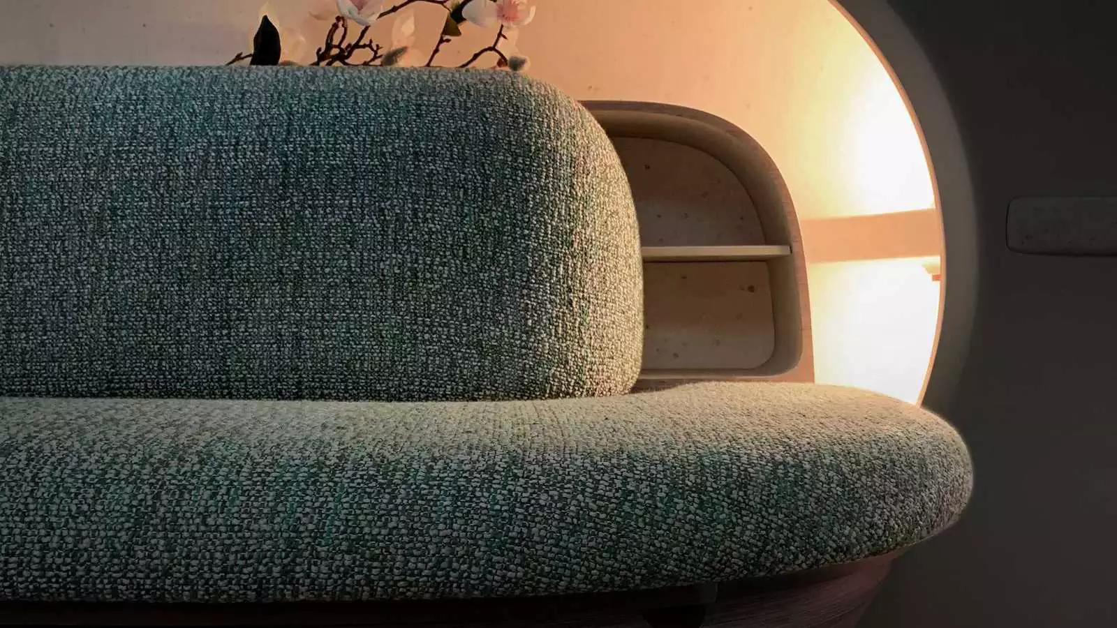 Компоновка с плоским полом задает стиль жилого помещения в большей степени, чем привычного интерьера автомобиля. Ткани на фото усиливают впечатление — типичная обивка дивана. Цветы дополняют картину.