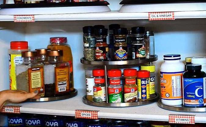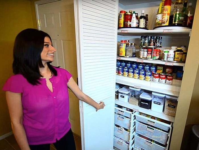 На кухне Алехандры все приправы, специи и витамины находятся на вращающихся подносах, крупы и макароны в прозрачных контейнерах, всё подписано, а на каждой полочке размещены таблички с названиями. Для чайных пакетиков есть свой отдельный органайзер, в котором все пакетики разложены по типу и вкусу. Посуда расположена на полках, сковородки стоят вертикально для удобства, столовое серебро лежит между разделителями, чтобы не двигалось при открытии ящика.
