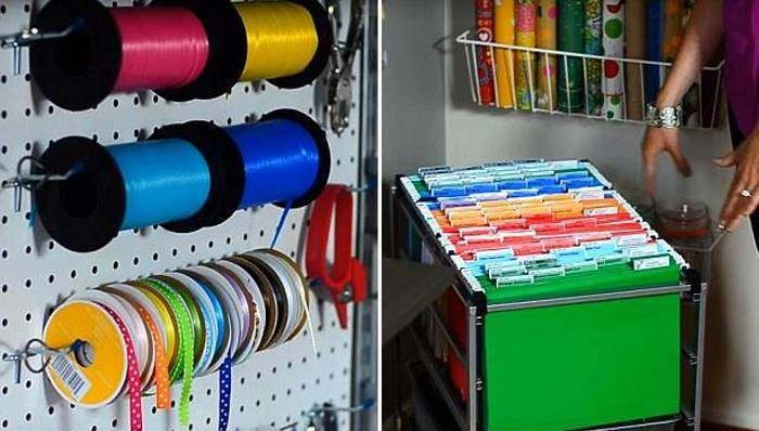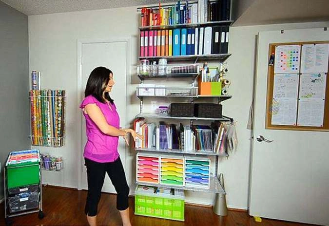 Кабинет Алехандры выполняет роль домашнего офиса и личной мастерской. Все необходимые для работы материалы хранятся здесь в прозрачных контейнерах на полках. На наборной доске висят ленты, ножницы и другие аксессуары. Все папки с документами упорядочены по цветам и разделены разноцветными ярлычками.