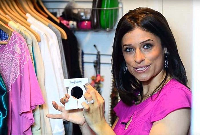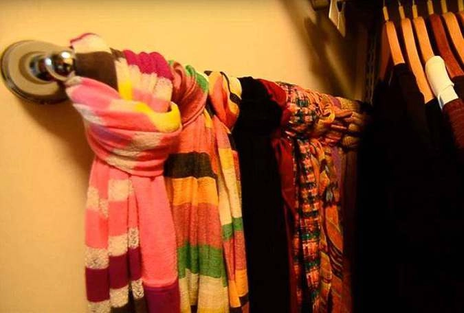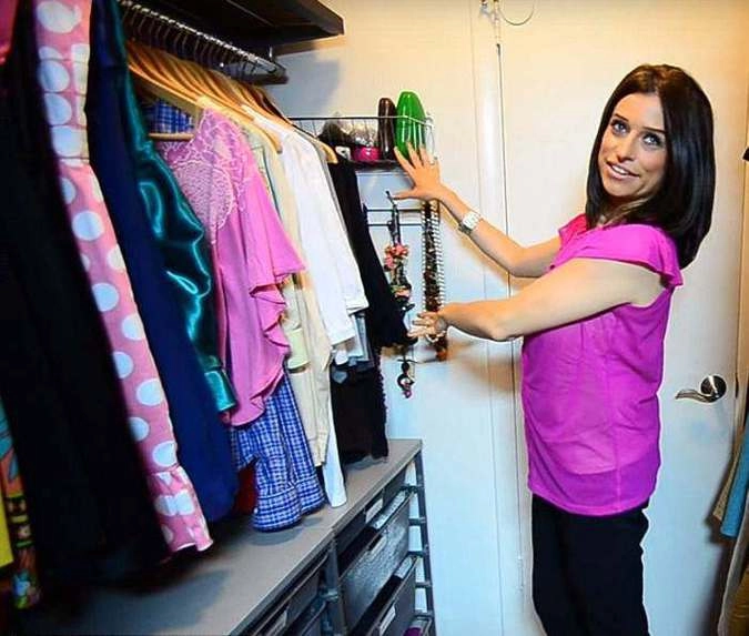 Всю одежду в гардеробе перфекционистка Алехандра разделила на категории с помощью ярлыков. На каждой вешалке цветная клипса, означающая категорию одежды. Длинные ожерелья висят на крючках, шарфы — на специальном держателе.