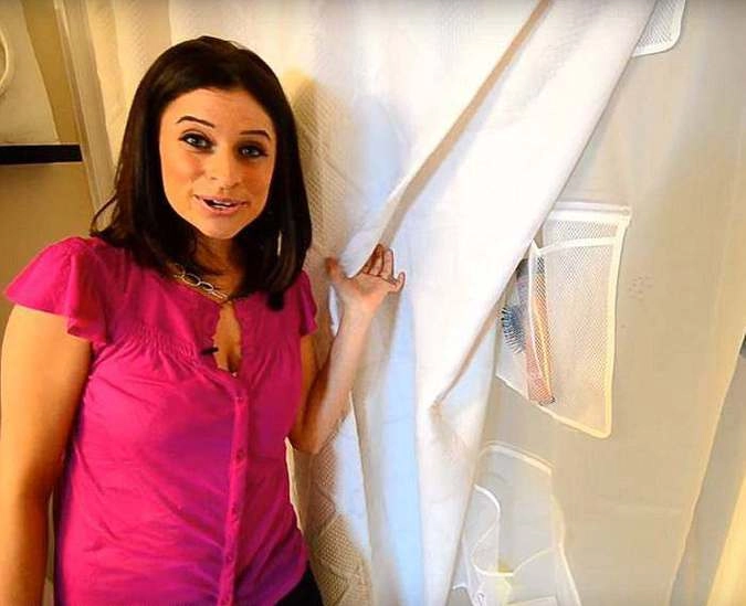 В ванной комнате также царит идеальная чистота и порядок. Аксессуары для волос и макияжа расположены в органайзере на задней стороне двери, средства гигиены и щётки для волос спрятаны за занавеской для душа.