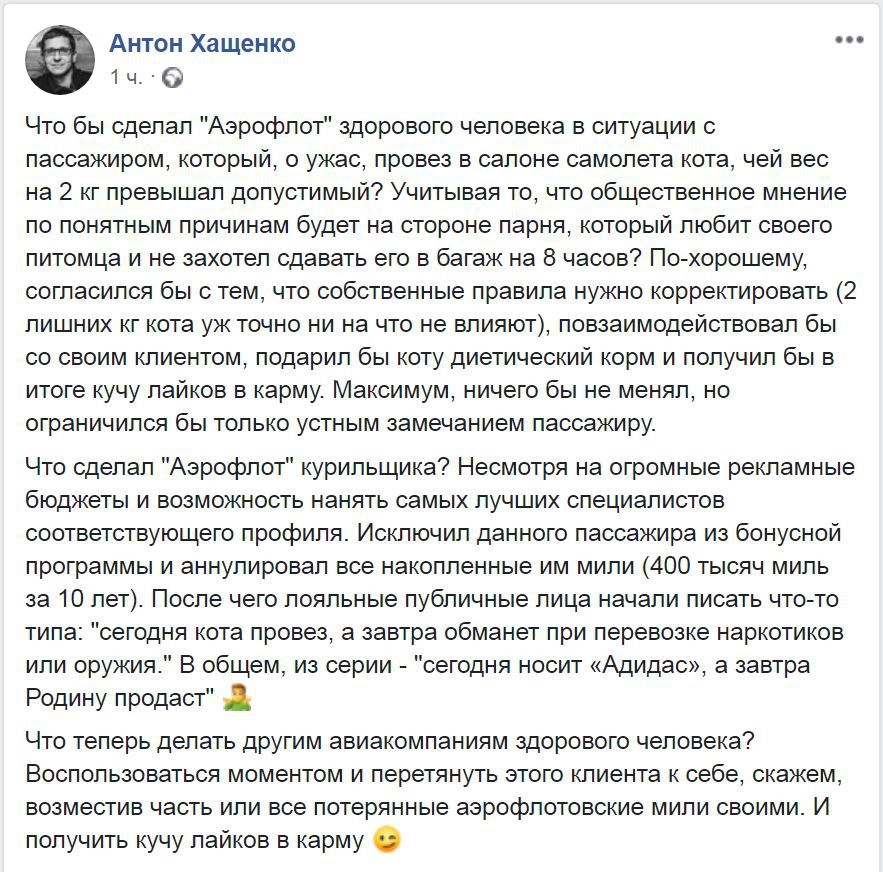 «Следил за развитием этой истории. Шанс погибнуть у небольшого животного, перевозимого в багаже — 50/50. В салоне же он никому не мешал, тем более что везли его в бизнес классе. Нормальные компании просто закрывают на это глаза, ибо понимают, что с авиабезопасностью это никак не связано. „Аэрофлот“ отныне лично для меня компания — нон грата. Виктору и его хозяину — респект и уважуха. Игнор компании полный! Пускай свои мили они себе на что-нибудь намотают», — написал Максим Легуенко.